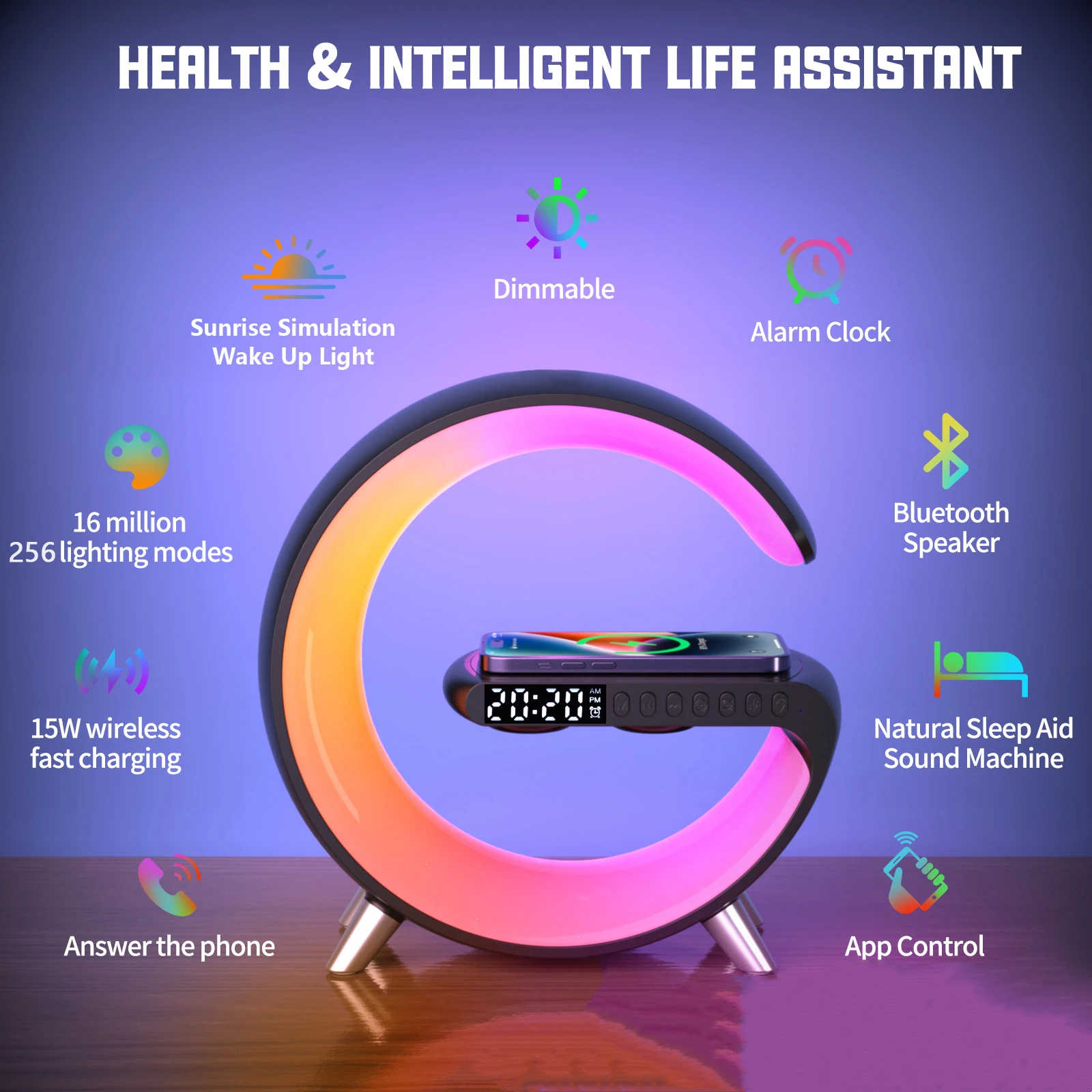 • Multi-function: alarm clock, night light, wireless charging, Bluetooth speaker